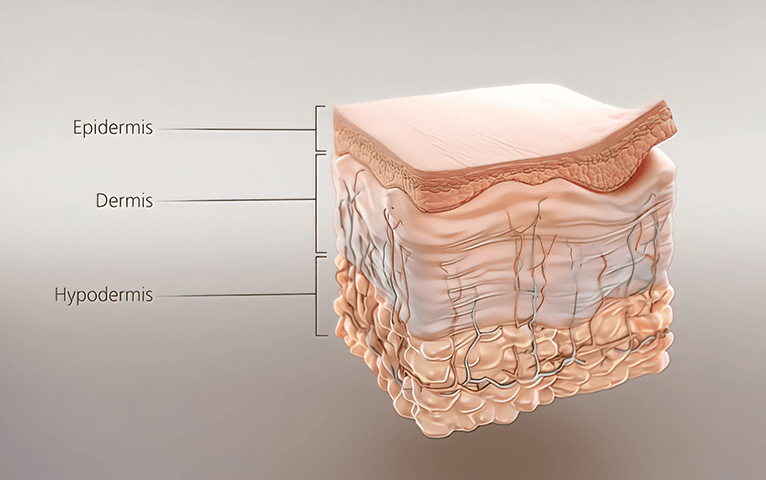 เป็นชั้นผิวที่มีความสำคัญเพราะมีองค์ประกอบที่ดูแลให้ผิวมีความแข็งแรงและยืดหยุ่นอย่าง “คอลลาเจนและอิลาสติน” รวมตัวกันอยู่ในชั้นนี้ โดยเนื้อเยื่อในชั้นหนังแท้ที่เกี่ยวพันกันเอาไว้นั้น มีส่วนช่วยให้ผิวของเราแข็งแรง ดูสุขภาพดี แต่เมื่ออายุของเรามากขึ้น ความยืดหยุ่นและคอลลาเจนในชั้นผิวจะลดน้อยลงส่งผลให้เกิดเป็นริ้วรอยต่างๆ ได้ เราจึงต้องหมั่นดูแลโครงสร้างผิวชั้นนี้ด้วยสกินแคร์ที่มีส่วนช่วยกระตุ้นการสร้างคอลลาเจน รวมไปถึงเสริมความแข็งแรง กระชับและเพิ่มความสามารถในการอุ้มน้ำให้ผิว คงความชุ่มชื้นด้วยกรดไฮยาลูรอน