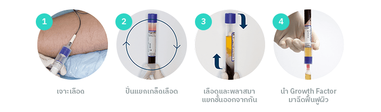 การนำเลือดของเราเองมาปั่นแยกในเครื่องหมุนเหวี่ยงพิเศษ (Centrifuge) เพื่อสกัดเอาเกล็ดเลือดจากชั้นที่มีความเข้มข้นสูงสุด นั่นก็คือชั้น Platelet-rich Plasma ซึ่งเป็นชั้นที่มี Growth Factor อยู่มากที่สุด มีคุณสมบัติในการกระตุ้นเซลล์ให้เกิดการซ่อมแซม กระตุ้นการสร้างเส้นใยคอลลาเจน รวมไปถึงการสร้างเซลล์ผิวใหม่ จากนั้นฉีดกลับเข้าไปในบริเวณที่ต้องการฟื้นฟู เช่น เส้นผมหรือใบหน้า โดยไม่เป็นอันตรายต่อร่างกาย เนื่องจากเป็นส่วนประกอบจากเลือดของตัวเราเอง